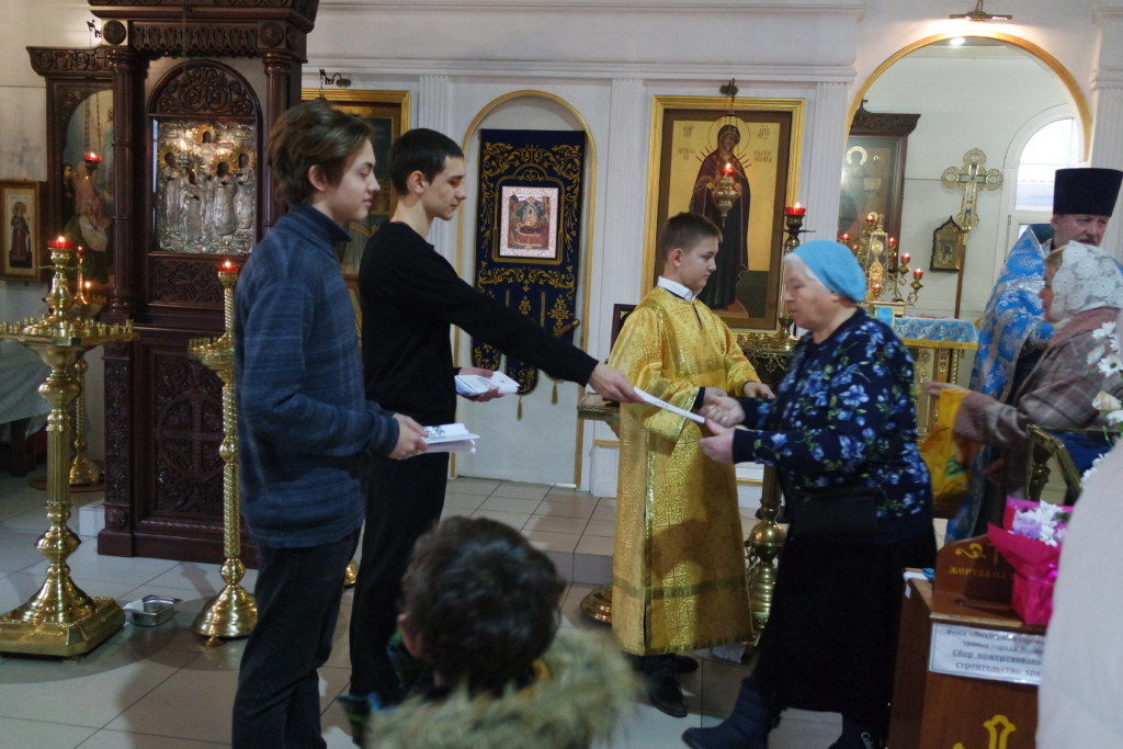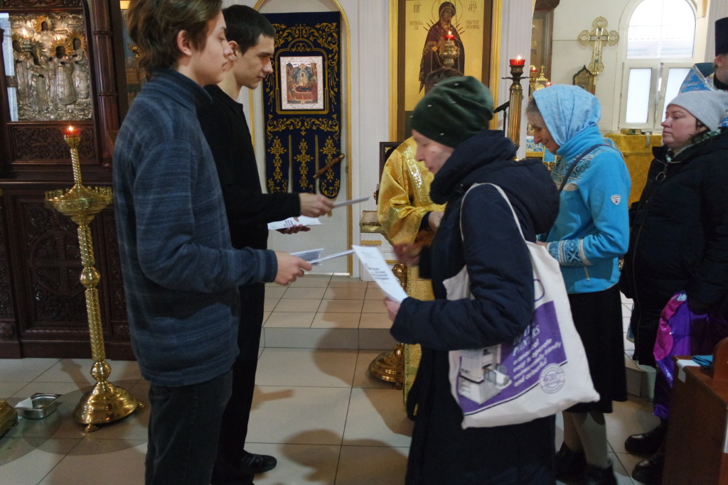 Актив приходского молодежного объединения передали молящимся миссионерские листки «Введение во храм Пресвятой Богородицы».
