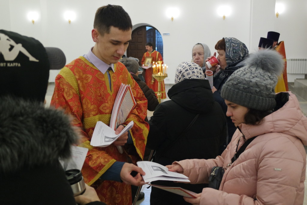 Молодежный актив храма передали молящимся приходские миссионерские листки о священномученике митрополите Серафиме.
