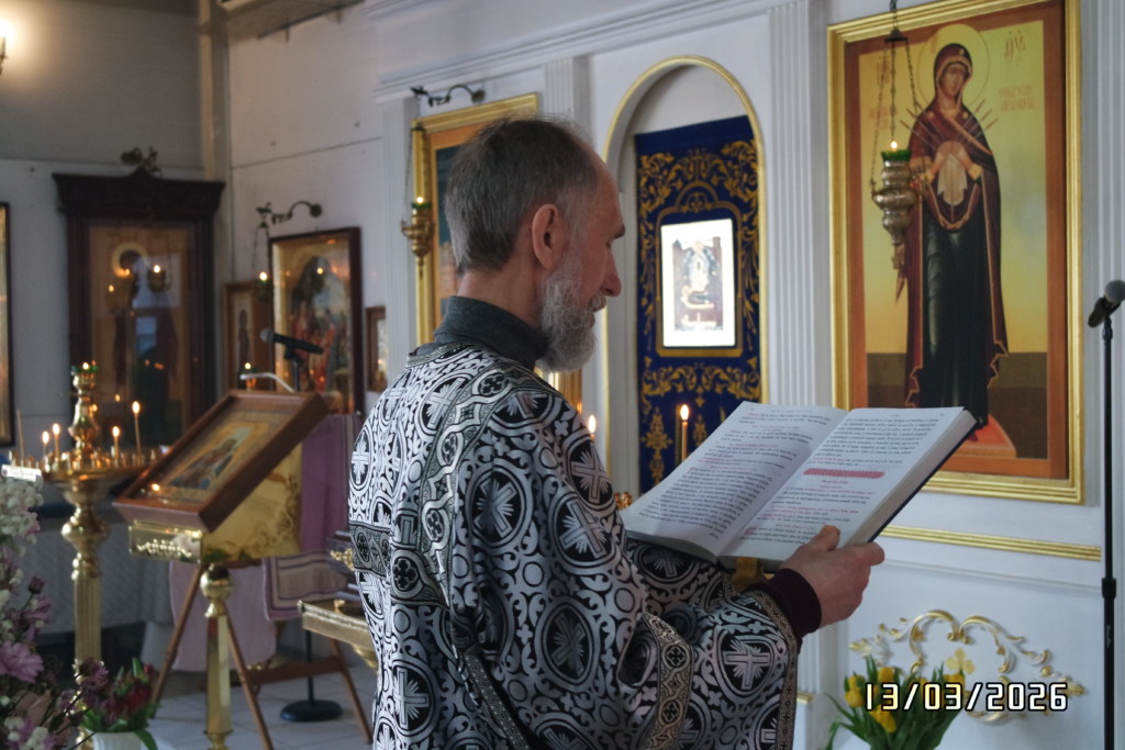 13 марта 2026 года, в пятницу 3-й седмицы Великого поста, прп. Васи́лия Декаполита, исп. (750), в храме Священномученика Серафима, митрополита Петроградского г.Москвы настоятель храма иерей Максим Глухих совершил великопостную утреню, часы, изобразительны и Литургию Преждеосвященных Даров.